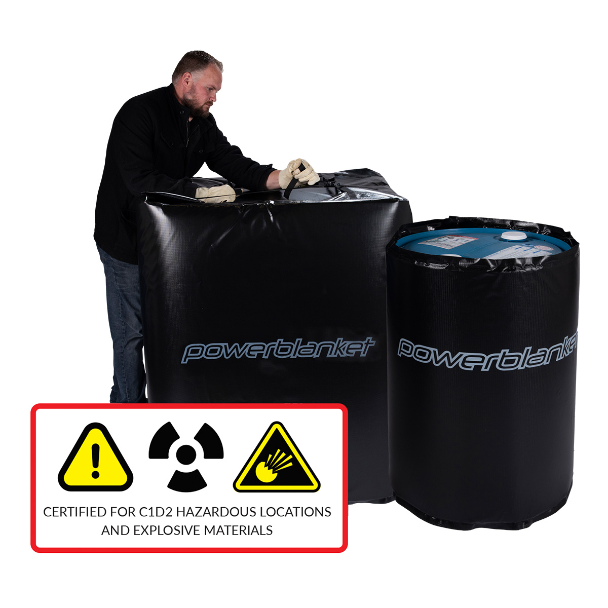 Additionally, certified for C1D2 hazardous locations, the 330-gallon hazardous area drum & tote heaters feature special wiring and safety equipment, offering explosion-proof protection. As a result, these heaters improve the viscosity of your materials, protect against freezing, and ensure even heating across the entire container. Whether you’re working with 330-gallon totes, IBCs, or drums, our tote heaters and IBC container heaters provide a comprehensive solution for heating in hazardous locations. Powerblanket’s heaters are designed with an intrinsically safe approach, making them suitable for areas with flammable gases, vapors, or dust.