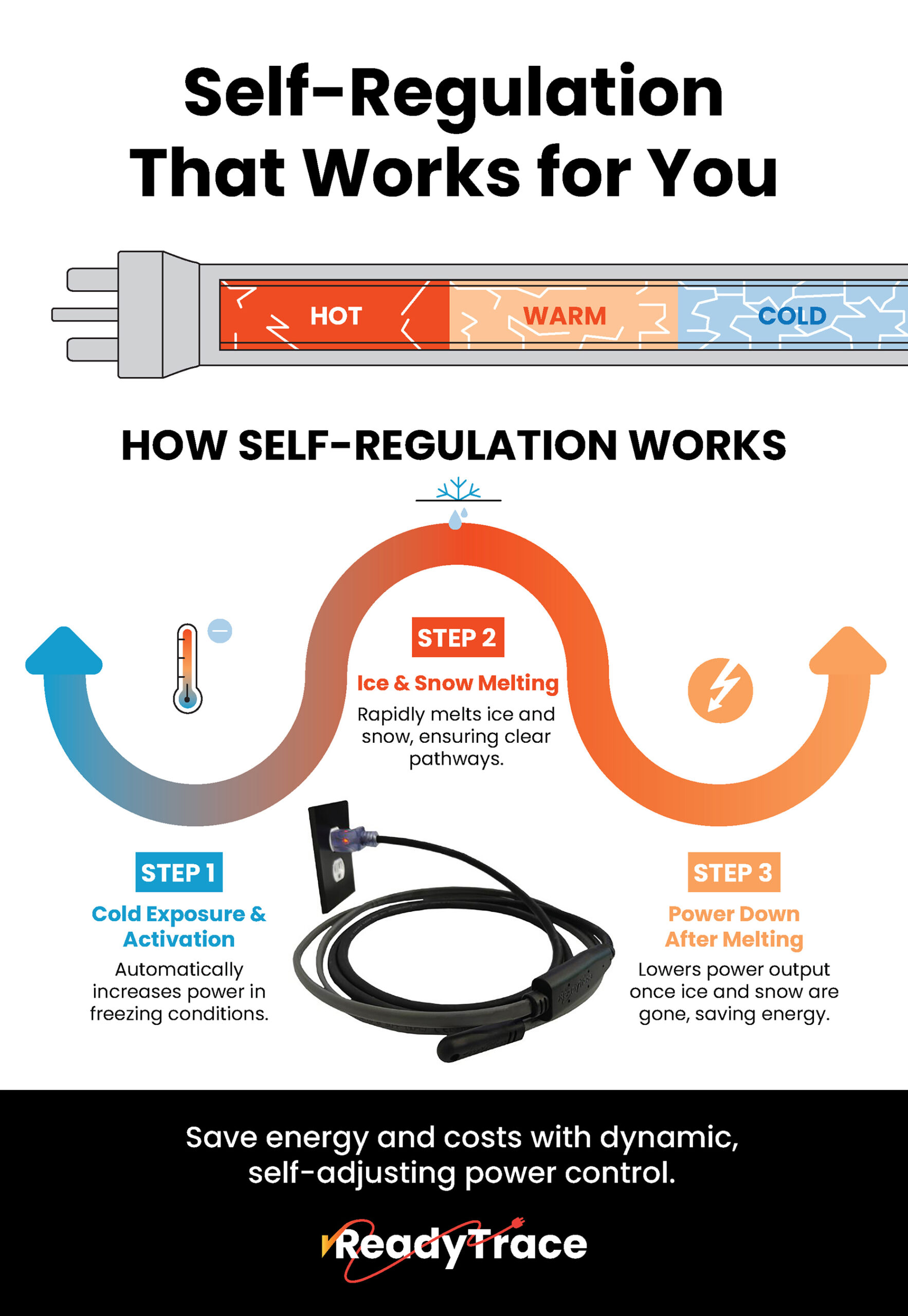 ReadyTrace™ cables do the work for you, adjusting their heat output in real time as temperatures change. When the cold sets in, they ramp up heat to melt snow and ice quickly. As conditions improve, they dial back power, saving you energy and cutting costs. It’s a simpler, more efficient approach to winter protection—no monitoring, guesswork, or wasted energy needed.