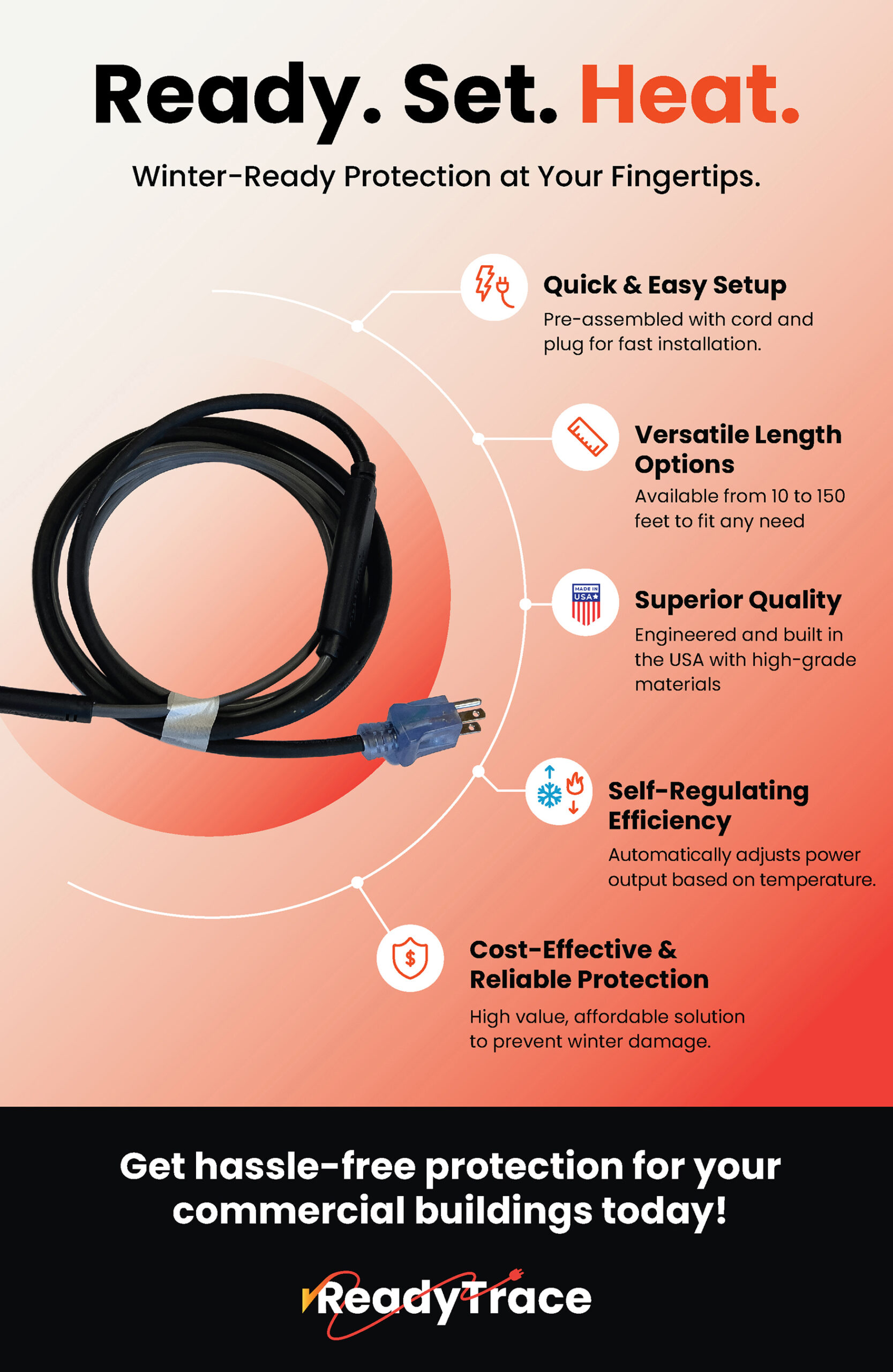 With ReadyTrace™, you don’t have to wrestle with complicated installs or settle for inferior materials. Each system arrives ready-to-go, adapts to your exact length requirements, and self-regulates its power for optimal efficiency. Engineered and manufactured in the USA, ReadyTrace™ delivers a cost-effective, high-value solution to keep your commercial property safe, secure, and free from winter-related damage—all without the usual hassle.