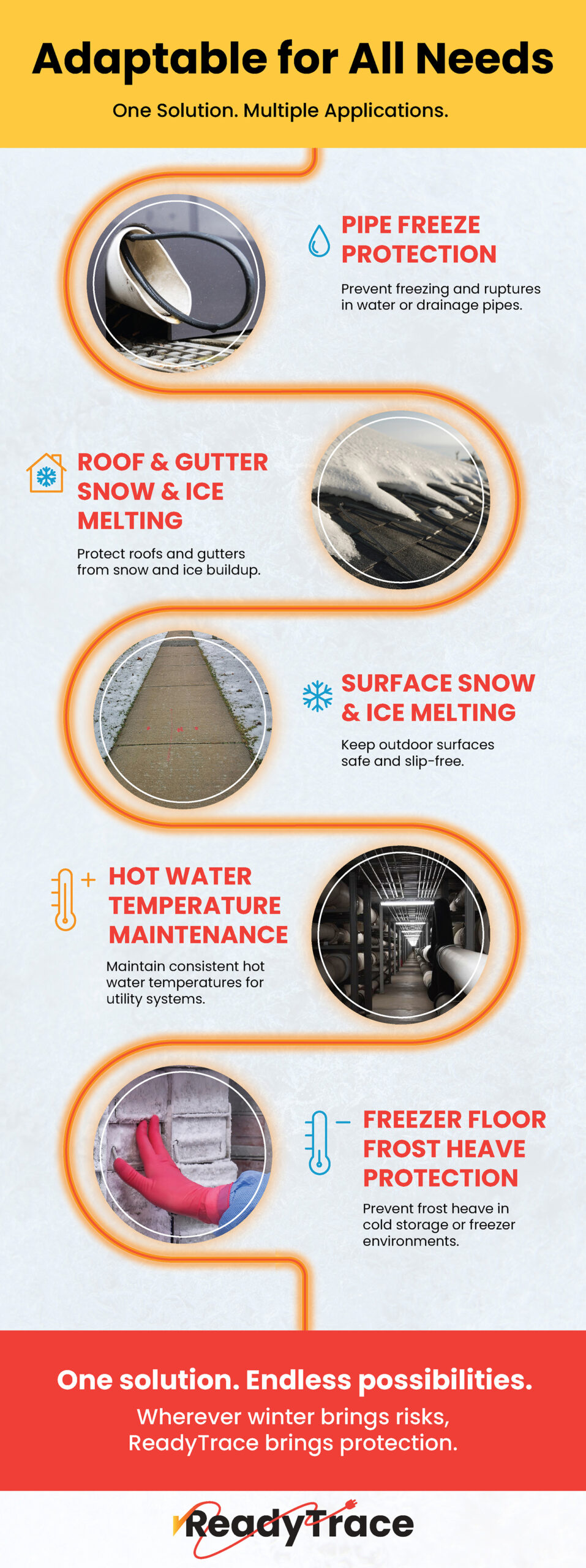 No matter how winter challenges your property, ReadyTrace™ has you covered. Our versatile heat trace solutions adapt effortlessly to protect pipes, roofs, gutters, walkways, and even sensitive industrial areas like cold storage floors. From ensuring steady hot water supply to preventing ice buildup in high-risk zones, ReadyTrace™ helps you maintain a safer, more efficient environment—no matter what conditions you’re up against.