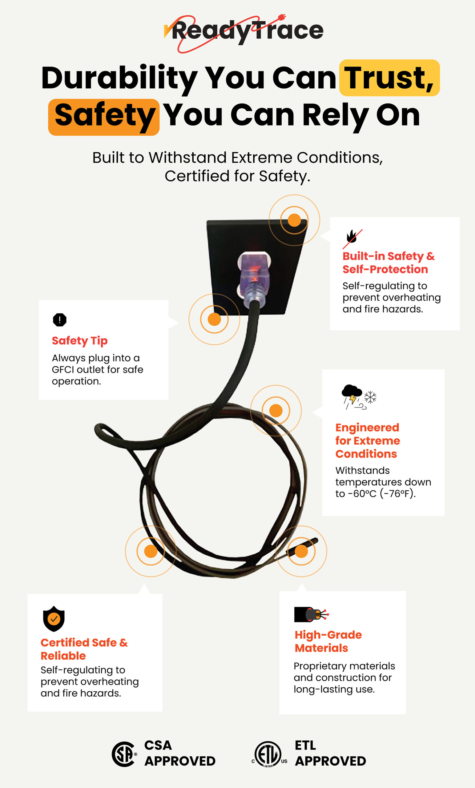 When it comes to keeping your building protected in the harshest of winters, ReadyTrace™ delivers more than just heat—it provides unwavering peace of mind. Designed for intense, sub-zero conditions, our cable systems rely on premium, proprietary materials that won’t crack, split, or fail when it matters most. Each unit is self-regulating to prevent dangerous overheating, thoroughly tested, and certified safe. For the best results, always plug into a GFCI outlet, and trust ReadyTrace™ to outlast the cold season after season.